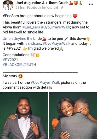 Joel Augustine A has now revealed that the prayer walk held in Akwa Ibom during the protest helped two soulmates meet. He wrote:
