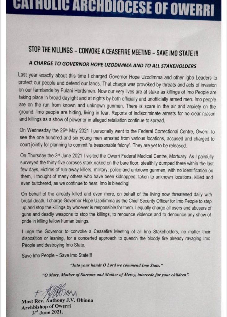 Catholic Bishop of Owerri, Anthony Obinna writes Uzodinma over Killings in Imo