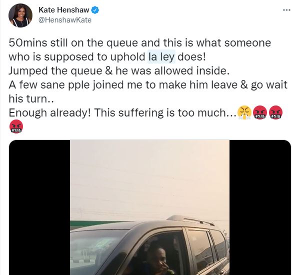 Actress Kate Henshaw and some others at a filling station in Lagos stood their grounds to insist that a security officer who wanted to jump the queue didn’t succeed.