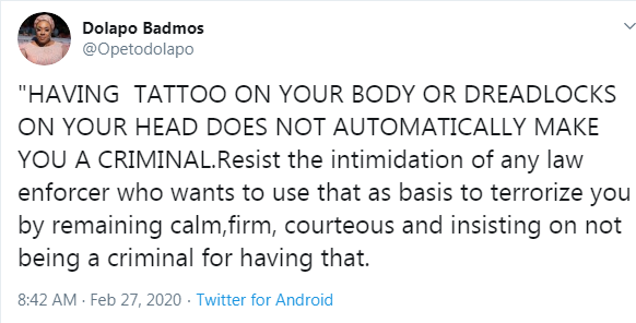 Lagos state Police PRO, Dolapo Badmus, has told Nigerians to know their rights and not allow law enforcement agents to intimidate them simply because they have tattoos on their bodies or dreadlocks on their head.