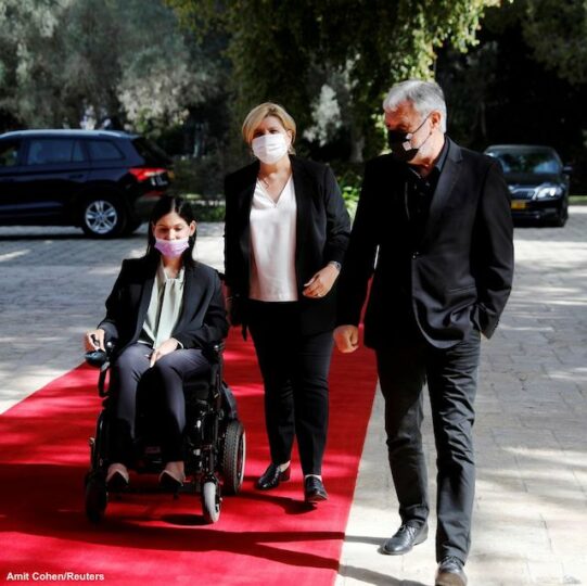 For two hours – according to the minister’s press office – organisers prevented Elharrar, who suffers from muscular dystrophy, from entering the compound with the vehicle she arrived in.