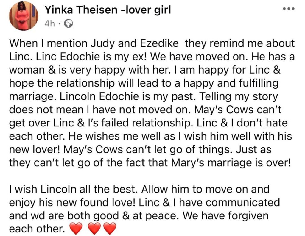 In a post shared on social media this morning, Yinka said she and Linc have communicated and that they are in a good place. She further stated that they have both forgiven each other and that she wishes Linc all the best in his new relationship.