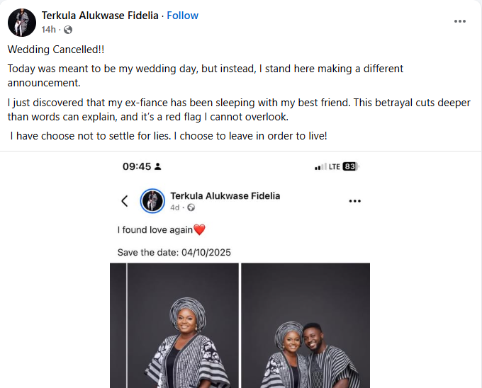 The lady announced the cancellation in a Facebook post on Saturday, October 4, 2025, the day the wedding was supposed to hold.