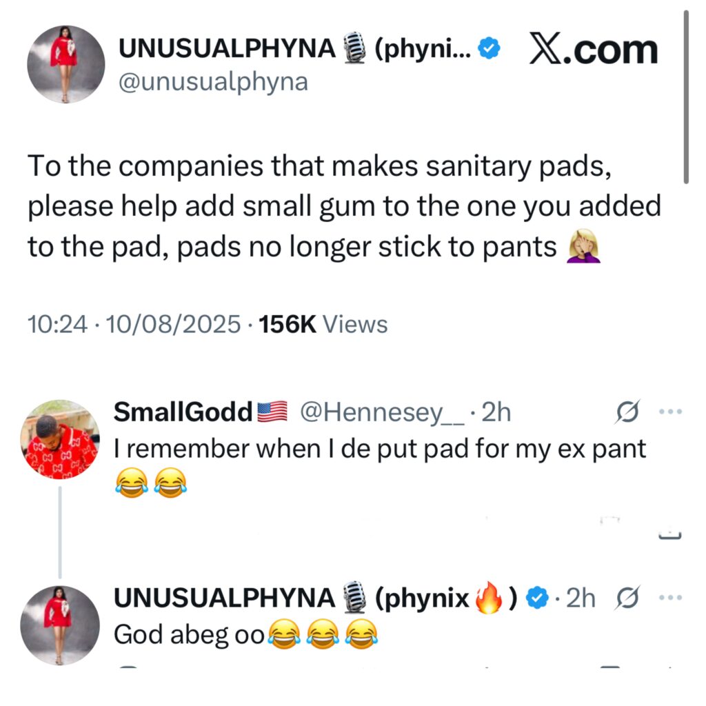 In a post she shared on X, Phyna who was worried about the poor adhesiveness of pads, begged sanitary pad producers to add more “gum” to the pads.