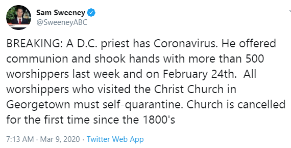 According to WUSA, the statement from Rev. Timothy Cole revealed that he attended three services last Sunday at Christ Church Georgetown, which were attended by 550 people.