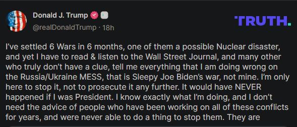 Speaking on his Truth Social, the president claimed he had already “settled 6 wars in 6 months, one of them a possible nuclear disaster,” and argued that media outlets like the Wall Street Journal were unfairly questioning his methods.
