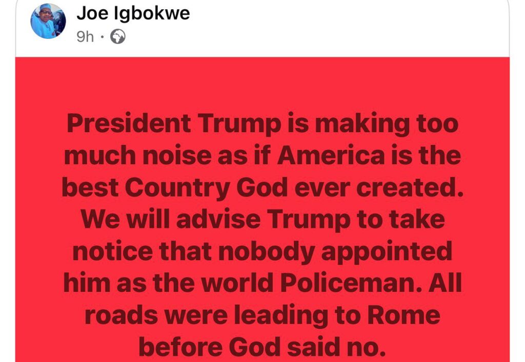Joe Igbokwe, APC chieftain, has said that US President Donald Trump has been ‘’making too much noise” as if America is the best Country God ever created.